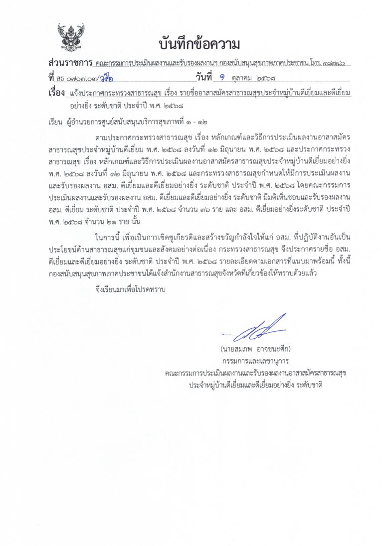 ประกาศกระทรวงสาธารณสุข เรื่อง รายชื่ออาสาสมัครสาธารณสุขประจำหมู่บ้านดีเยี่ยมและดีเยี่ยมอย่างยิ่ง ระดับชาติ ประจำปี พ.ศ. 2568
