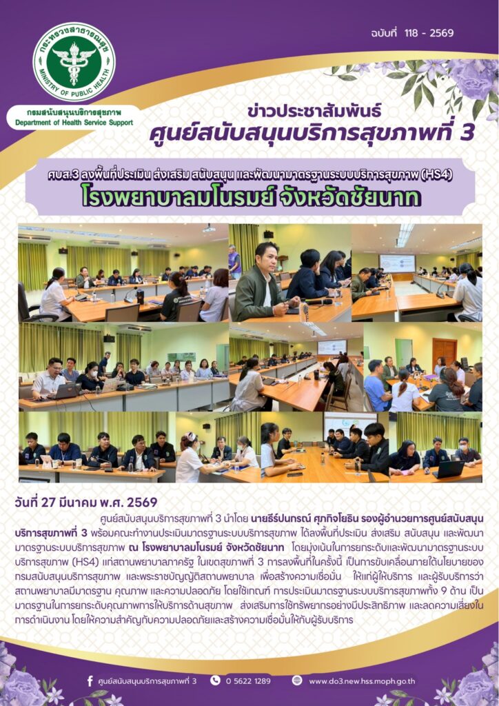 ศบส.3 ลงพื้นที่ประเมิน ส่งเสริม สนับสนุน และพัฒนามาตรฐานระบบบริการสุขภาพ (HS4) โรงพยาบาลมโนรมย์ จังหวัดชัยนาท วันที่ 27 มีนาคม พ.ศ. 2569 ศูนย์สนับสนุนบริการสุขภาพที่ 3 นําโดย นายธีร์ปนกรณ์ ศุภกิจโยธิน รองผู้อํานวยการศูนย์สนับสนุนบริการสุขภาพที่ 3 พร้อมคณะทํางานประเมินมาตรฐานระบบบริการสุขภาพ ได้ลงพื้นที่ประเมิน ส่งเสริม สนับสนุน และพัฒนา มาตรฐานระบบบริการสุขภาพ ณ โรงพยาบาลมโนรมย์ จังหวัดชัยนาท โดยมุ่งเน้นในการยกระดับและพัฒนามาตรฐานระบบ บริการสุขภาพ (HS4) แก่สถานพยาบาลภาครัฐ ในเขตสุขภาพที่ 3 การลงพื้นที่ในครั้งนี้ เป็นการขับเคลื่อนภายใต้นโยบายของ กรมสนับสนุนบริการสุขภาพ และพระราชบัญญัติสถานพยาบาล เพื่อสร้างความเชื่อมั่น ให้แก่ผู้ให้บริการ และผู้รับบริการว่า สถานพยาบาลมีมาตรฐาน คุณภาพ และความปลอดภัย โดยใช้เกณฑ์ การประเมินมาตรฐานระบบบริการสุขภาพทั้ง 9 ด้าน เป็น มาตรฐานในการยกระดับคุณภาพการให้บริการด้านสุขภาพ ส่งเสริมการใช้ทรัพยากรอย่างมีประสิทธิภาพ และลดความเสี่ยงในการดําเนินงาน โดยให้ความสําคัญกับความปลอดภัยและสร้างความเชื่อมั่นให้กับผู้รับบริการ