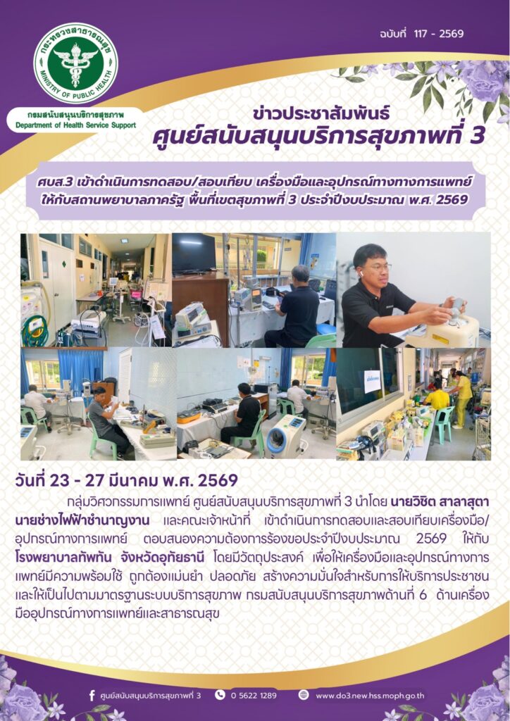 ศบส.3 เข้าดําเนินการทดสอบ/สอบเทียบ เครื่องมือและอุปกรณ์ทางทางการแพทย์ ให้กับโรงพยาบาลทัพทัน จังหวัดอุทัยธานี ประจําปีงบประมาณ พ.ศ. 2569 วันที่ 23 – 27 มีนาคม พ.ศ. 2569 กลุ่มวิศวกรรมการแพทย์ ศูนย์สนับสนุนบริการสุขภาพที่ 3 นําโดย นายวิชิต สาลาสุตา นายช่างไฟฟ้าชํานาญงาน และคณะเจ้าหน้าที่ เข้าดําเนินการทดสอบและสอบเทียบเครื่องมือ/อุปกรณ์ทางการแพทย์ ตอบสนองความต้องการร้องขอประจําปีงบประมาณ 2569 ให้กับ โรงพยาบาลทัพทัน จังหวัดอุทัยธานี โดยมีวัตถุประสงค์ เพื่อให้เครื่องมือและอุปกรณ์ทางการ แพทย์มีความพร้อมใช้ ถูกต้องแม่นยํา ปลอดภัย สร้างความมั่นใจสําหรับการให้บริการประชาชน และให้เป็นไปตามมาตรฐานระบบบริการสุขภาพ กรมสนับสนุนบริการสุขภาพด้านที่ 6 ด้านเครื่อง มืออุปกรณ์ทางการแพทย์และสาธารณสุข