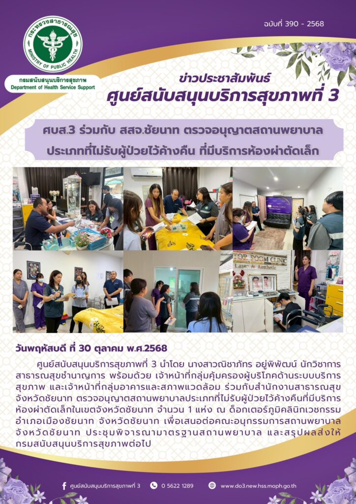 ศบส.3 ร่วมกับ สสจ.ชัยนาท ตรวจอนุญาตสถานพยาบาล ประเภทที่ไม่รับผู้ป่วยไว้ค้างคืน ที่มีบริการห้องผ่าตัดเล็ก ศบส.3 ร่วมกับ สสจ.ชัยนาท ตรวจอนุญาตสถานพยาบาล ประเภทที่ไม่รับผู้ป่วยไว้ค้างคืน ที่มีบริการห้องผ่าตัดเล็ก วันที่ 30 ตุลาคม พ.ศ. 2568 ศูนย์สนับสนุนบริการสุขภาพที่ 3 นําโดย นางสาวณิชาภัทร อยู่พิพัฒน์ นักวิชาการสาธารณสุขชํานาญการ พร้อมด้วย เจ้าหน้าที่กลุ่มคุ้มครองผู้บริโภคด้านระบบบริการสุขภาพ และเจ้าหน้าที่กลุ่มอาคารและสภาพแวดล้อม ร่วมกับสํานักงานสาธารณสุข จังหวัดชัยนาท ตรวจอนุญาตสถานพยาบาลประเภทที่ไม่รับผู้ป่วยไว้ค้างคืนที่มีบริการ ห้องผ่าตัดเล็กในเขตจังหวัดชัยนาท จํานวน 1 แห่ง ณ ด็อกเตอร์ภูมิคลินิกเวชกรรม อําเภอเมืองชัยนาท จังหวัดชัยนาท เพื่อเสนอต่อคณะอนุกรรมการสถานพยาบาล จังหวัดชัยนาท ประชุมพิจารณามาตรฐานสถานพยาบาล และสรุปผลส่งให้ กรมสนับสนุนบริการสุขภาพต่อไป