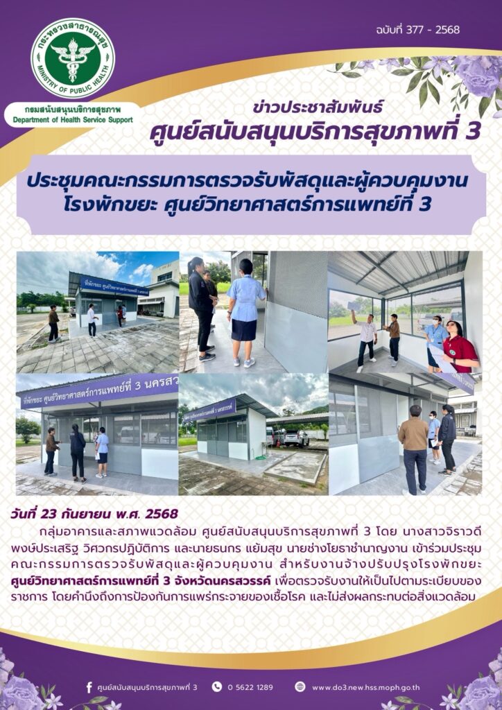 ศบส.3 ประชุมคณะกรรมการตรวจรับพัสดุและผู้ควบคุมงาน โรงพักขยะ ศูนย์วิทยาศาสตร์การแพทย์ที่ 3 ศบส.3 ประชุมคณะกรรมการตรวจรับพัสดุและผู้ควบคุมงาน โรงพักขยะ ศูนย์วิทยาศาสตร์การแพทย์ที่ 3 วันที่ 23 กันยายน พ.ศ. 2568 กลุ่มอาคารและสภาพแวดล้อม ศูนย์สนับสนุนบริการสุขภาพที่ 3 โดย นางสาวจิราวดี พงษ์ประเสริฐ วิศวกรปฏิบัติการ และนายธนกร แย้มสุข นายช่างโยธาชํานาญงาน เข้าร่วมประชุม คณะกรรมการตรวจรับพัสดุและผู้ควบคุมงาน สําหรับงานจ้างปรับปรุงโรงพักขยะ ศูนย์วิทยาศาสตร์การแพทย์ที่ 3 จังหวัดนครสวรรค์ เพื่อตรวจรับงานให้เป็นไปตามระเบียบของ ราชการ โดยคํานึงถึงการป้องกันการแพร่กระจายของเชื้อโรค และไม่ส่งผลกระทบต่อสิ่งแวดล้อม