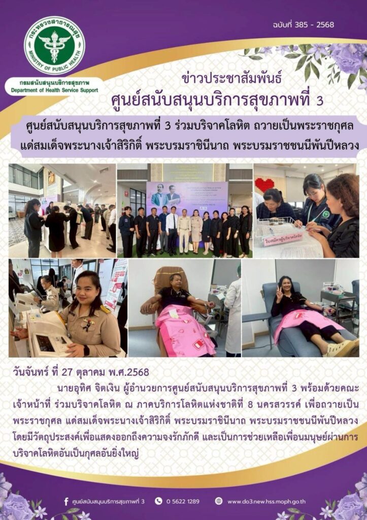 ร่วมบริจาคโลหิต ถวายเป็นพระราชกุศล แด่สมเด็จพระนางเจ้าสิริกิติ์ พระบรมราชินีนาถ พระบรมราชชนนีพันปีหลวง ร่วมบริจาคโลหิต ถวายเป็นพระราชกุศล แด่สมเด็จพระนางเจ้าสิริกิติ์ พระบรมราชินีนาถ พระบรมราชชนนีพันปีหลวง วันที่ 27 ตุลาคม พ.ศ. 2568 นายอุทิศ จิตเงิน ผู้อํานวยการศูนย์สนับสนุนบริการสุขภาพที่ 3 พร้อมด้วยคณะ เจ้าหน้าที่ ร่วมบริจาคโลหิต ณ ภาคบริการโลหิตแห่งชาติที่ 8 นครสวรรค์ เพื่อถวายเป็น พระราชกุศล แด่สมเด็จพระนางเจ้าสิริกิติ์ พระบรมราชินีนาถ พระบรมราชชนนีพันปีหลวง โดยมีวัตถุประสงค์เพื่อแสดงออกถึงความจงรักภักดี และเป็นการช่วยเหลือเพื่อนมนุษย์ผ่านการ บริจาคโลหิตอันเป็นกุศลอันยิ่งใหญ่