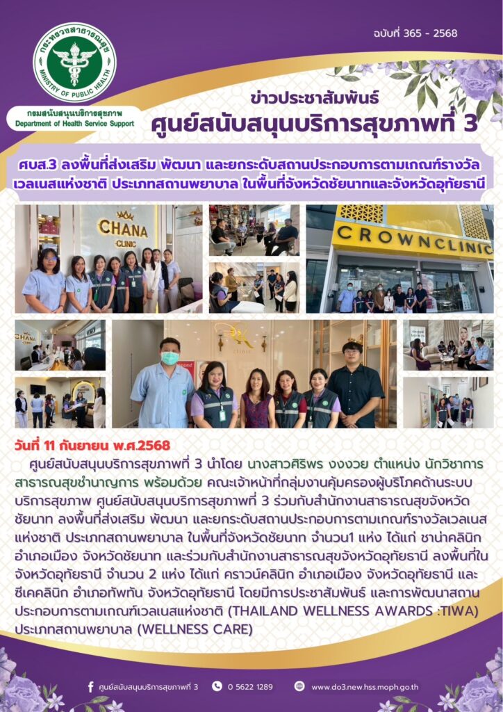 ศบส.3 ลงพื้นที่ส่งเสริม พัฒนา และยกระดับสถานประกอบการตามเกณฑ์รางวัล เวลเนสแห่งชาติ ประเภทสถานพยาบาล ในพื้นที่จังหวัดชัยนาทและจังหวัดอุทัยธานี