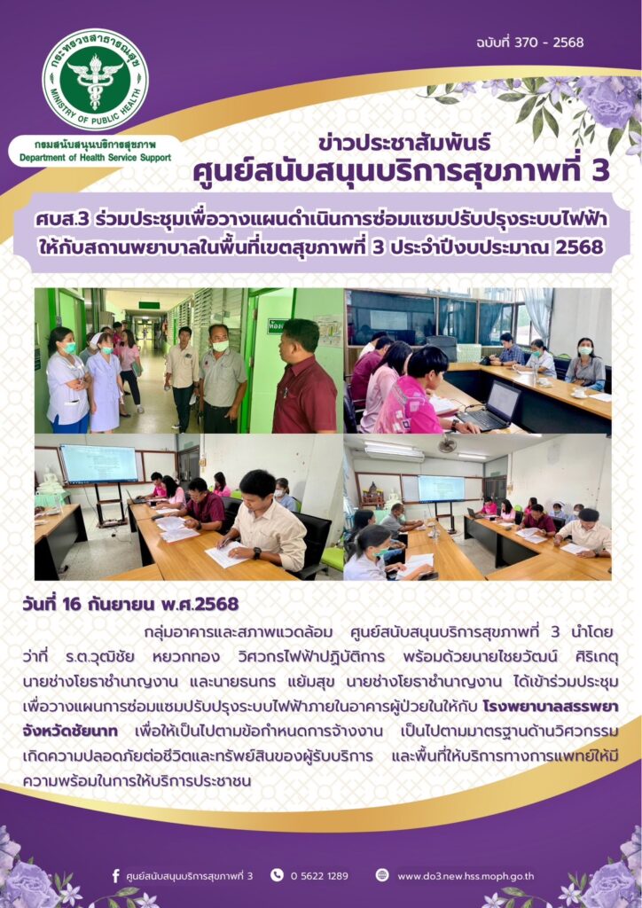 ศบส.3 ร่วมประชุมเพื่อวางแผนดําเนินการซ่อมแซมปรับปรุงระบบไฟฟ้า ให้กับสถานพยาบาลในพื้นที่เขตสุขภาพที่ 3 ประจําปีงบประมาณ 2568 ศบส.3 ร่วมประชุมเพื่อวางแผนดําเนินการซ่อมแซมปรับปรุงระบบไฟฟ้า ให้กับสถานพยาบาลในพื้นที่เขตสุขภาพที่ 3 ประจําปีงบประมาณ 2568 วันที่ 16 กันยายน พ.ศ. 2568 กลุ่มอาคารและสภาพแวดล้อม ศูนย์สนับสนุนบริการสุขภาพที่ 3 นําโดย ว่าที่ ร.ต.วุฒิชัย หยวกกอง วิศวกรไฟฟ้าปฏิบัติการ พร้อมด้วยนายไชยวัฒน์ ศิริเกตุ นายช่างโยธาชํานาญงาน และนายธนกร แย้มสุข นายช่างโยธาชํานาญงาน ได้เข้าร่วมประชุม เพื่อวางแผนการซ่อมแซมปรับปรุงระบบไฟฟ้าภายในอาคารผู้ป่วยในให้กับ โรงพยาบาลสรรพยา จังหวัดชัยนาท เพื่อให้เป็นไปตามข้อกําหนดการจ้างงาน เป็นไปตามมาตรฐานด้านวิศวกรรม เกิดความปลอดภัยต่อชีวิตและทรัพย์สินของผู้รับบริการ และพื้นที่ให้บริการทางการแพทย์ให้มีความพร้อมในการให้บริการประชาชน