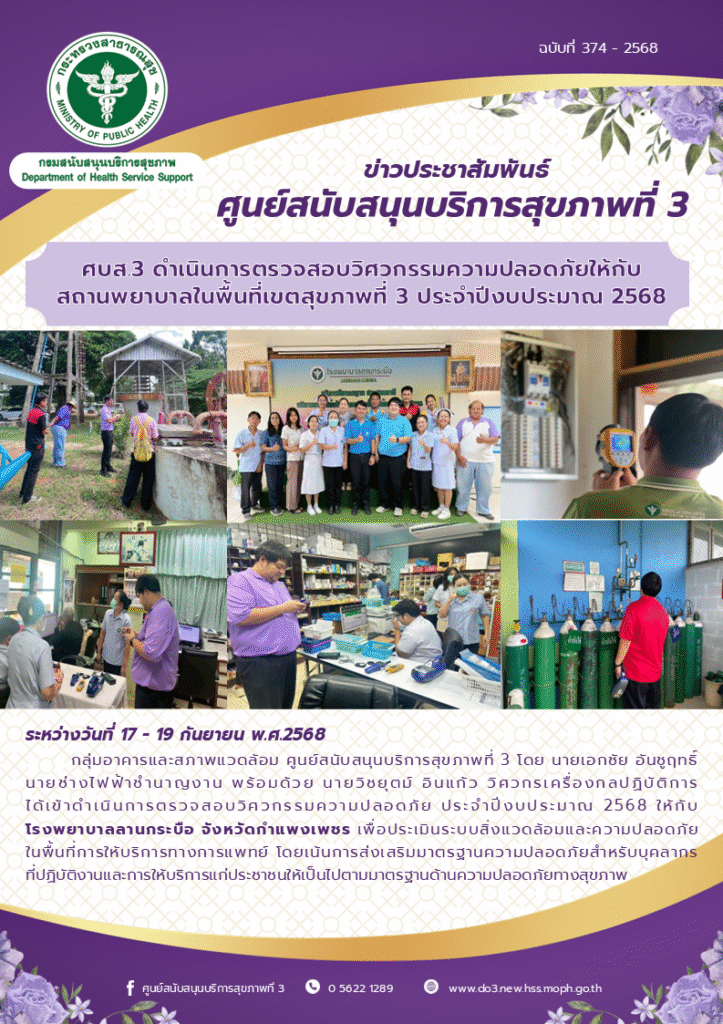 ศบส.3 ดําเนินการตรวจสอบวิศวกรรมความปลอดภัยให้กับ โรงพยาบาลลานกระบือ จังหวัดกําแพงเพชร ประจําปีงบประมาณ 2568 ศบส.3 ดําเนินการตรวจสอบวิศวกรรมความปลอดภัยให้กับ โรงพยาบาลลานกระบือ จังหวัดกําแพงเพชร ประจําปีงบประมาณ 2568 วันที่ 19 กันยายน พ.ศ. 2568 กลุ่มอาคารและสภาพแวดล้อม ศูนย์สนับสนุนบริการสุขภาพที่ 3 โดย นายเอกชัย อันชูฤทธิ์ นายช่างไฟฟ้าชํานาญงาน พร้อมด้วย นายวิชยุตม์ อินแก้ว วิศวกรเครื่องกลปฏิบัติการ ได้เข้าดําเนินการตรวจสอบวิศวกรรมความปลอดภัย ประจําปีงบประมาณ 2568 ให้กับ โรงพยาบาลลานกระบือ จังหวัดกําแพงเพชร เพื่อประเมินระบบสิ่งแวดล้อมและความปลอดภัย ในพื้นที่การให้บริการทางการแพทย์ โดยเน้นการส่งเสริมมาตรฐานความปลอดภัยสําหรับบุคลากรที่ปฎิบัติงานและการให้บริการแก่ประชาชนให้เป็นไปตามมาตรฐานด้านความปลอดภัยทางสุขภาพ