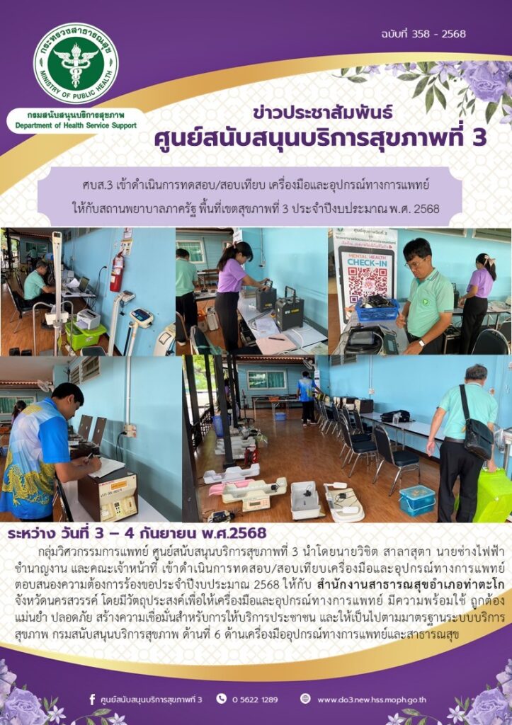 ศบส.3 เข้าดําเนินการทดสอบ/สอบเทียบ เครื่องมือและอุปกรณ์ทางการแพทย์ ให้กับสํานักงานสาธารณสุขอําเภอท่าตะโก จังหวัดนครสวรรค์ ประจําปีงบประมาณ พ.ศ. 2568 ศบส.3 เข้าดําเนินการทดสอบ/สอบเทียบ เครื่องมือและอุปกรณ์ทางการแพทย์ ให้กับสํานักงานสาธารณสุขอําเภอท่าตะโก จังหวัดนครสวรรค์ ประจําปีงบประมาณ พ.ศ. 2568 วันที่ 3 – 4 กันยายน พ.ศ. 2568 กลุ่มวิศวกรรมการแพทย์ ศูนย์สนับสนุนบริการสุขภาพที่ 3 นําโดยนายวิชิต สาลาสุตา นายช่างไฟฟ้าชํานาญงาน และคณะเจ้าหน้าที่ เข้าดําเนินการทดสอบ/สอบเทียบเครื่องมือและอุปกรณ์ทางการแพทย์ ตอบสนองความต้องการร้องขอประจําปีงบประมาณ 2568 ให้กับ สํานักงานสาธารณสุขอําเภอท่าตะโก จังหวัดนครสวรรค์ โดยมีวัตถุประสงค์เพื่อให้เครื่องมือและอุปกรณ์ทางการแพทย์ มีความพร้อมใช้ ถูกต้อง แม่นยํา ปลอดภัย สร้างความเชื่อมั่นสําหรับการให้บริการประชาชน และให้เป็นไปตามมาตรฐานระบบบริการ สุขภาพ กรมสนับสนุนบริการสุขภาพ ด้านที่ 6 ด้านเครื่องมืออุปกรณ์ทางการแพทย์และสาธารณสุข