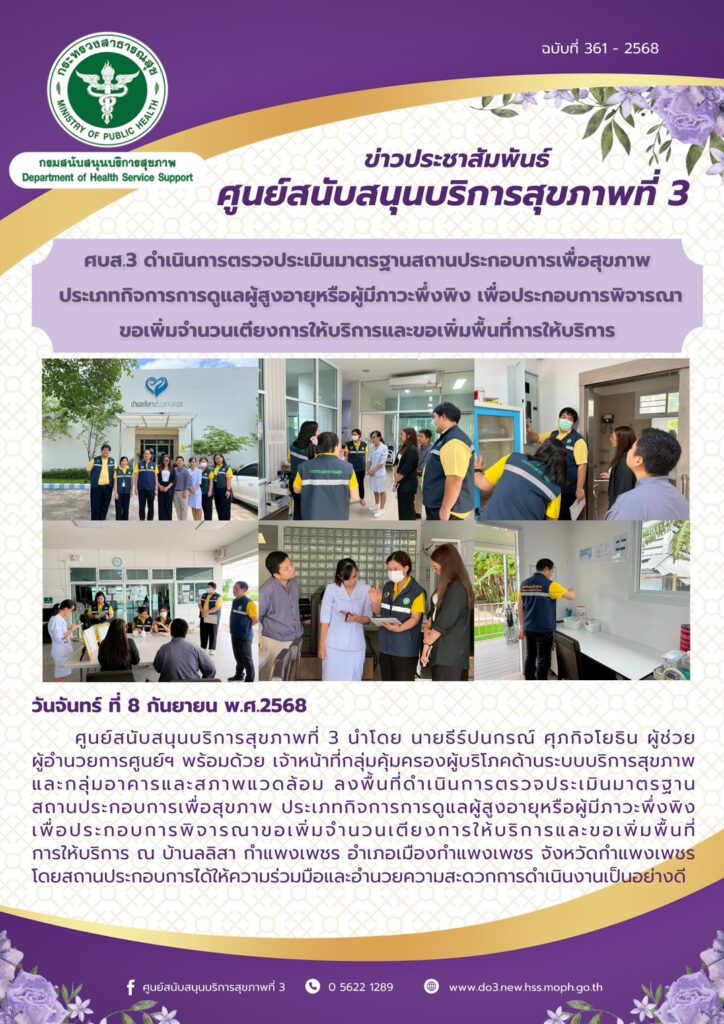 ศบส.3 ดําเนินการตรวจประเมินมาตรฐานสถานประกอบการเพื่อสุขภาพ ประเภทกิจการการดูแลผู้สูงอายุหรือผู้มีภาวะพึ่งพิง เพื่อประกอบการพิจารณา ขอเพิ่มจํานวนเตียงการให้บริการและขอเพิ่มพื้นที่การให้บริการ ศบส.3 ดําเนินการตรวจประเมินมาตรฐานสถานประกอบการเพื่อสุขภาพ ประเภทกิจการการดูแลผู้สูงอายุหรือผู้มีภาวะพึ่งพิง เพื่อประกอบการพิจารณา ขอเพิ่มจํานวนเตียงการให้บริการและขอเพิ่มพื้นที่การให้บริการ วันที่ 8 กันยายน พ.ศ. 2568 ศูนย์สนับสนุนบริการสุขภาพที่ 3 นําโดย นายธีร์ปนกรณ์ ศุภกิจโยธิน ผู้ช่วย ผู้อํานวยการศูนย์ฯ พร้อมด้วย เจ้าหน้าที่กลุ่มคุ้มครองผู้บริโภคด้านระบบบริการสุขภาพ และกลุ่มอาคารและสภาพแวดล้อม ลงพื้นที่ดําเนินการตรวจประเมินมาตรฐาน สถานประกอบการเพื่อสุขภาพ ประเภทกิจการการดูแลผู้สูงอายุหรือผู้มีภาวะพึ่งพิง เพื่อประกอบการพิจารณาขอเพิ่มจํานวนเตียงการให้บริการและขอเพิ่มพื้นที่การให้บริการ ณ บ้านลลิสา กําแพงเพชร อําเภอเมืองกําแพงเพชร จังหวัดกําแพงเพชร โดยสถานประกอบการได้ให้ความร่วมมือและอํานวยความสะดวกการดําเนินงานเป็นอย่างดี