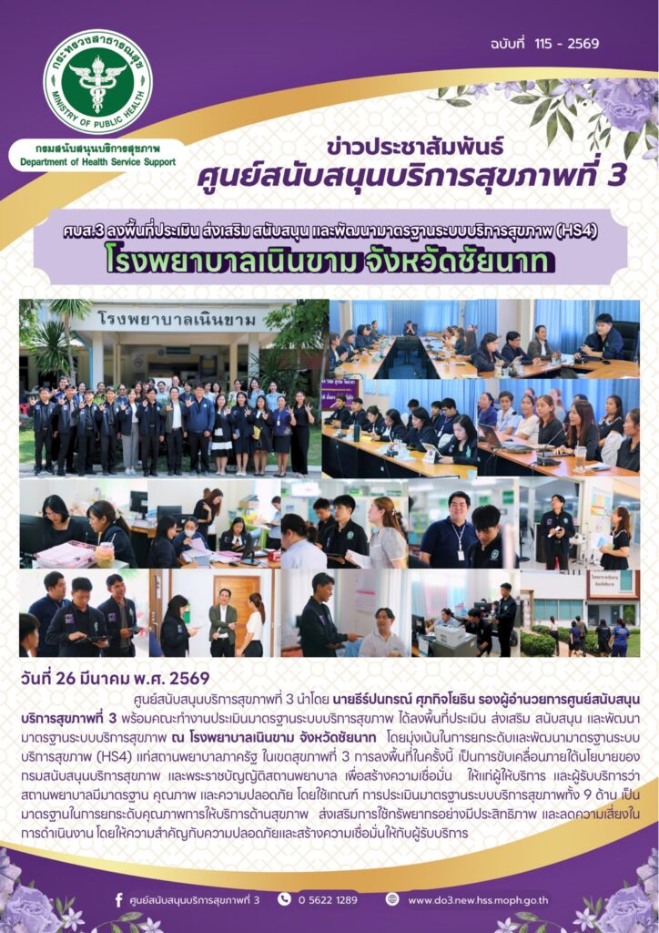 ศบส.3 ลงพื้นที่ประเมิน ส่งเสริม สนับสนุน และพัฒนามาตรฐานระบบบริการสุขภาพ (HS4) โรงพยาบาลเนินขาม จังหวัดชัยนาท วันที่ 26 มีนาคม พ.ศ. 2569 ศูนย์สนับสนุนบริการสุขภาพที่ 3 นําโดย นายธีร์ปนกรณ์ ศุภกิจโยธิน รองผู้อํานวยการศูนย์สนับสนุนบริการสุขภาพที่ 3 พร้อมคณะทํางานประเมินมาตรฐานระบบบริการสุขภาพ ได้ลงพื้นที่ประเมิน ส่งเสริม สนับสนุน และพัฒนา มาตรฐานระบบบริการสุขภาพ ณ โรงพยาบาลเนินขาม จังหวัดชัยนาท โดยมุ่งเน้นในการยกระดับและพัฒนามาตรฐานระบบ บริการสุขภาพ (HS4) แก่สถานพยาบาลภาครัฐ ในเขตสุขภาพที่ 3 การลงพื้นที่ในครั้งนี้ เป็นการขับเคลื่อนภายใต้นโยบายของ กรมสนับสนุนบริการสุขภาพ และพระราชบัญญัติสถานพยาบาล เพื่อสร้างความเชื่อมั่น ให้แก่ผู้ให้บริการ และผู้รับบริการว่า สถานพยาบาลมีมาตรฐาน คุณภาพ และความปลอดภัย โดยใช้เกณฑ์ การประเมินมาตรฐานระบบบริการสุขภาพทั้ง 9 ด้าน เป็น มาตรฐานในการยกระดับคุณภาพการให้บริการด้านสุขภาพ ส่งเสริมการใช้ทรัพยากรอย่างมีประสิทธิภาพ และลดความเสี่ยงในการดําเนินงาน […]