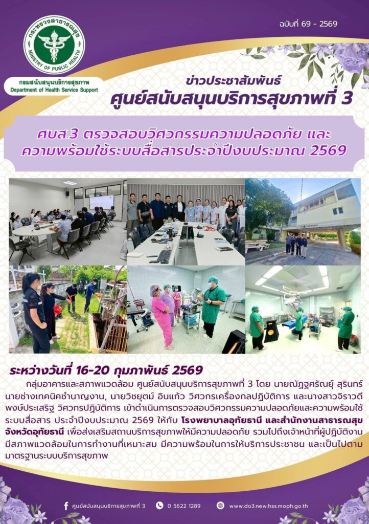 ศบส.3 ตรวจสอบวิศวกรรมความปลอดภัย และ ความพร้อมใช้ระบบสื่อสารประจําปีงบประมาณ 2569 วันที่ 16 – 20 กุมภาพันธ์ พ.ศ. 2569 กลุ่มอาคารและสภาพแวดล้อม ศูนย์สนับสนุนบริการสุขภาพที่ 3 โดย นายณัฎฐศรัณย์ สุรินทร์ นายช่างเทคนิคชํานาญงาน, นายวิชยุตม์ อินแก้ว วิศวกรเครื่องกลปฏิบัติการ และนางสาวจิราวดี พงษ์ประเสริฐ วิศวกรปฏิบัติการ เข้าดําเนินการตรวจสอบวิศวกรรมความปลอดภัยและความพร้อมใช้ ระบบสื่อสาร ประจําปีงบประมาณ 2569 ให้กับ โรงพยาบาลอุทัยธานี และสํานักงานสาธารณสุข จังหวัดอุทัยธานี เพื่อส่งเสริมสถานบริการสุขภาพให้มีความปลอดภัย รวมไปถึงเจ้าหน้าที่ผู้ปฎิบัติงานมีสภาพแวดล้อมในการทํางานที่เหมาะสม มีความพร้อมในการให้บริการประชาชน และเป็นไปตามมาตรฐานระบบบริการสุขภาพ