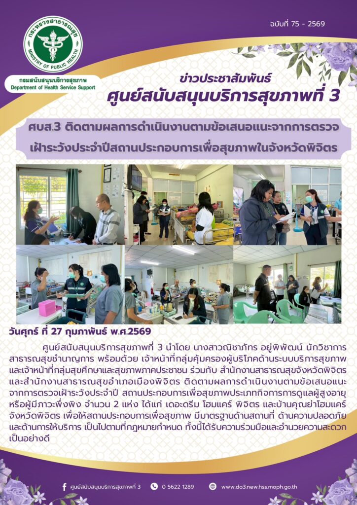 ศบส.3 ติดตามผลการดําเนินงานตามข้อเสนอแนะจากการตรวจ เฝ้าระวังประจําปีสถานประกอบการเพื่อสุขภาพในจังหวัดพิจิตร วันที่ 27 กุมภาพันธ์ พ.ศ. 2569 ศูนย์สนับสนุนบริการสุขภาพที่ 3 นําโดย นางสาวณิชาภัทร อยู่พิพัฒน์ นักวิชาการ สาธารณสุขชํานาญการ พร้อมด้วย เจ้าหน้าที่กลุ่มคุ้มครองผู้บริโภคด้านระบบบริการสุขภาพ และเจ้าหน้าที่กลุ่มสุขศึกษาและสุขภาพภาคประชาชน ร่วมกับ สํานักงานสาธารณสุขจังหวัดพิจิตร และสํานักงานสาธารณสุขอําเภอเมืองพิจิตร ติดตามผลการดําเนินงานตามข้อเสนอแนะ จากการตรวจเฝ้าระวังประจําปี สถานประกอบการเพื่อสุขภาพประเภทกิจการการดูแลผู้สูงอายุ หรือผู้มีภาวะพึ่งพิง จํานวน 2 แห่ง ได้แก่ เดอะดรีม โฮมแคร์ พิจิตร และบ้านคุณย่าโฮมแคร์ จังหวัดพิจิตร เพื่อให้สถานประกอบการเพื่อสุขภาพ มีมาตรฐานด้านสถานที่ ด้านความปลอดภัย และด้านการให้บริการ เป็นไปตามที่กฎหมายกําหนด ทั้งนี้ได้รับความร่วมมือและอํานวยความสะดวก เป็นอย่างดี