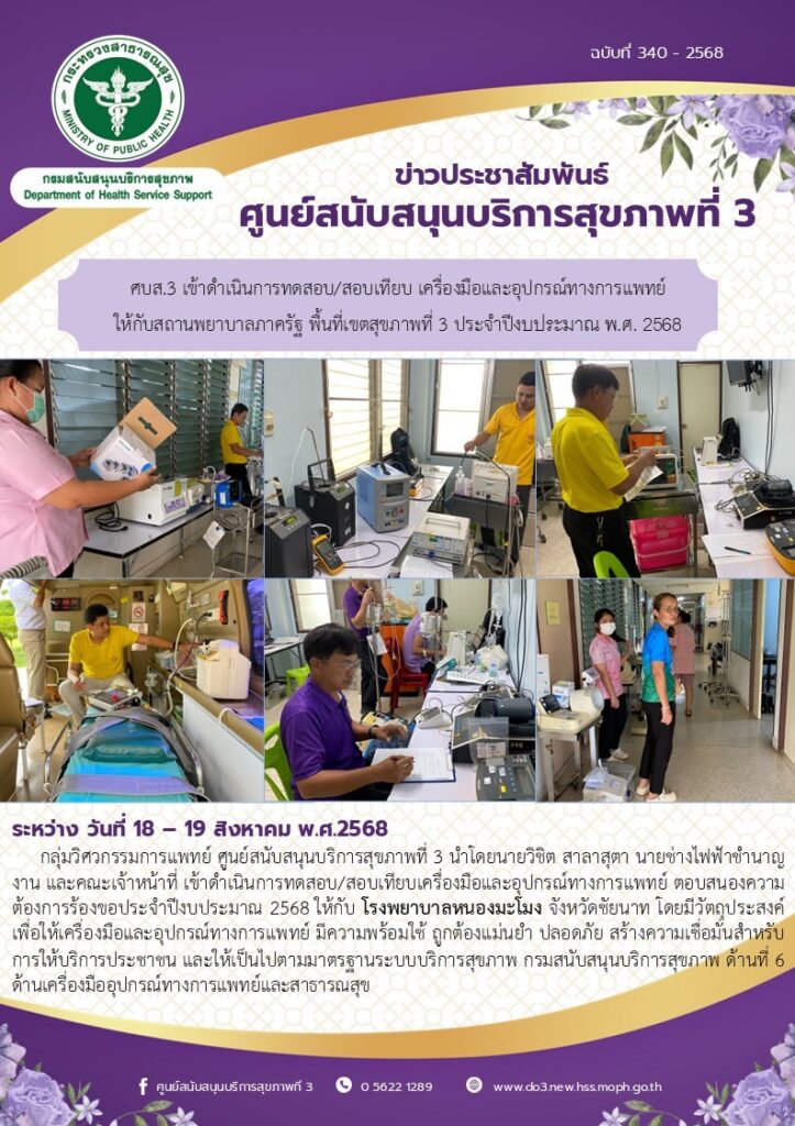 ศบส.3 เข้าดําเนินการทดสอบ/สอบเทียบ เครื่องมือและอุปกรณ์ทางการแพทย์ ให้กับโรงพยาบาลหนองมะโมง จังหวัดชัยนาท ประจําปีงบประมาณ พ.ศ. 2568 ศบส.3 เข้าดําเนินการทดสอบ/สอบเทียบ เครื่องมือและอุปกรณ์ทางการแพทย์ ให้กับโรงพยาบาลหนองมะโมง จังหวัดชัยนาท ประจําปีงบประมาณ พ.ศ. 2568 วันที่ 18 – 19 สิงหาคม พ.ศ. 2568 กลุ่มวิศวกรรมการแพทย์ ศูนย์สนับสนุนบริการสุขภาพที่ 3 นําโดยนายวิชิต สาลาสุตา นายช่างไฟฟ้าชํานาญ งาน และคณะเจ้าหน้าที่ เข้าดําเนินการทดสอบ/สอบเทียบเครื่องมือและอุปกรณ์ทางการแพทย์ ตอบสนองความ ต้องการร้องขอประจําปีงบประมาณ 2568 ให้กับ โรงพยาบาลหนองมะโมง จังหวัดชัยนาท โดยมีวัตถุประสงค์ เพื่อให้เครื่องมือและอุปกรณ์ทางการแพทย์ มีความพร้อมใช้ ถูกต้องแม่นยํา ปลอดภัย สร้างความเชื่อมั่นสําหรับ การให้บริการประชาชน และให้เป็นไปตามมาตรฐานระบบบริการสุขภาพ กรมสนับสนุนบริการสุขภาพ ด้านที่ 6 ด้านเครื่องมืออุปกรณ์ทางการแพทย์และสาธารณสุข