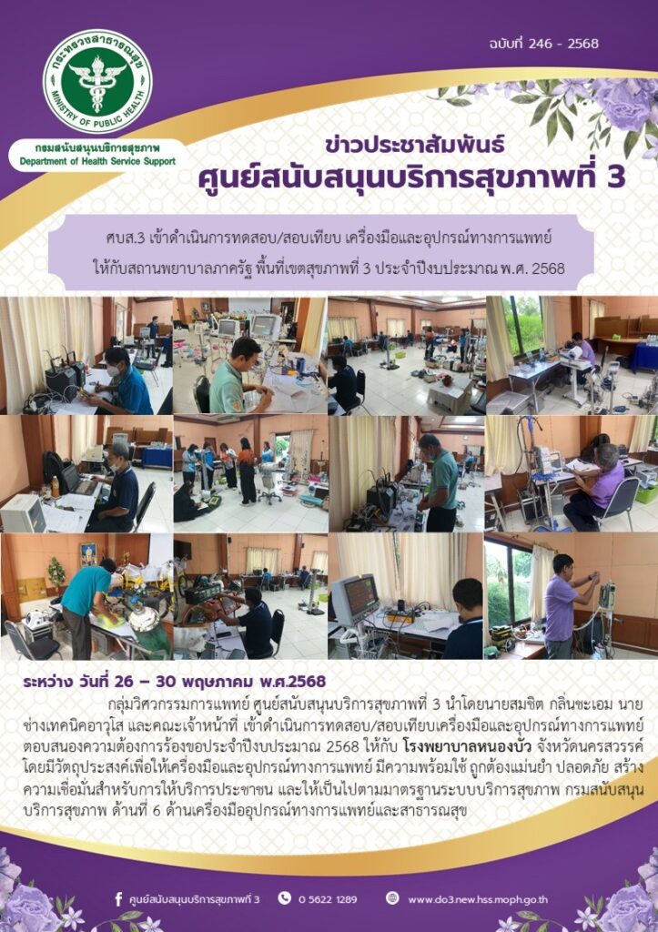 ศบส.3 เข้าดําเนินการทดสอบ/สอบเทียบ เครื่องมือและอุปกรณ์ทางการแพทย์ ให้กับโรงพยาบาลหนองบัว จังหวัดนครสวรรค์ ประจําปีงบประมาณ พ.ศ. 2568 ศบส.3 เข้าดําเนินการทดสอบ/สอบเทียบ เครื่องมือและอุปกรณ์ทางการแพทย์ ให้กับโรงพยาบาลหนองบัว จังหวัดนครสวรรค์ ประจําปีงบประมาณ พ.ศ. 2568 วันที่ 30 พฤษภาคม พ.ศ. 2568 กลุ่มวิศวกรรมการแพทย์ ศูนย์สนับสนุนบริการสุขภาพที่ 3 นําโดยนายสมชิต กลิ่นชะเอม นาย ช่างเทคนิคอาวุโส และคณะเจ้าหน้าที่ เข้าดําเนินการทดสอบ/สอบเทียบเครื่องมือ และอุปกรณ์ทางการแพทย์ ตอบสนองความต้องการร้องขอประจําปีงบประมาณ 2568 ให้กับ โรงพยาบาลหนองบัว จังหวัดนครสวรรค์ โดยมีวัตถุประสงค์เพื่อให้เครื่องมือและอุปกรณ์ทางการแพทย์ มีความพร้อมใช้ ถูกต้องแม่นยํา ปลอดภัย สร้าง ความเชื่อมั่นสําหรับการให้บริการประชาชน และให้เป็นไปตามมาตรฐานระบบบริการสุขภาพ กรมสนับสนุน บริการสุขภาพ ด้านที่ 6 ด้านเครื่องมืออุปกรณ์ทางการแพทย์และสาธารณสุข